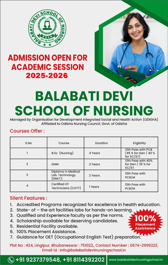 Balabati Devi School of Nursing managed by Organisation of Development Integrated Social and Health Action (ODISHA). Welcome to Balabati Devi School of Nursing, where your journey to becoming a skilled and compassionate healthcare professional begins.